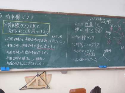 子ども達が苦戦したわり算の筆算はひとまず終わり,今週から折れ線グラフへと入っていきます。理科の気温調べで事前に学習したこともあり,グラフを見ただけで様々な意見が出ました。