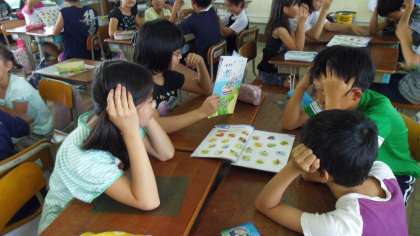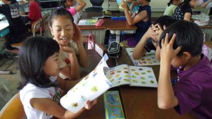 グループの1人が果物などの名前を「I like 〜.」と言って