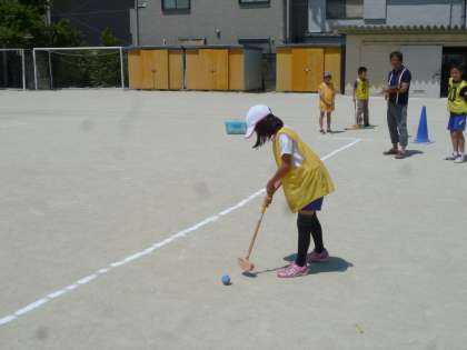 8つのホールに何打で入れられるかを競いました。5人ずつのチーム戦で行いました。少しずつ上手になってきました。次回も参加したいという子どもがたくさんいました。