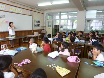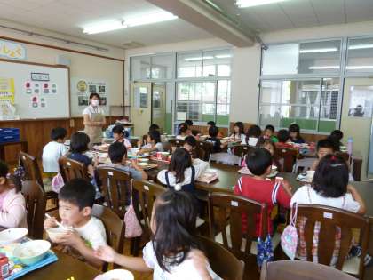 1年生の各クラがス順番に,「正しい食べ方をしよう」の学習をしています。山本先生から「よい姿勢で」「よくかんで」「ごはんとおかずを交互に」と教えていただきました。そのあと,ランチルームで,クラスのみんなと楽しく給食を食べました。