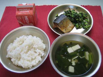 今日の給食は,胚芽米ごはん・牛乳・さばの変わり煮・大根葉のごま炒め・すまし汁です。