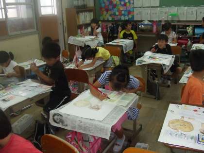 絵の具を使って今回は身体測定の様子を描きました。コンテで線描きをした後絵の具を塗っていきます。パレットで絵の具を混ぜて,顔の色や肌の色を作りぬりました。なかなかうまく塗れなくてみんな奮闘しています。