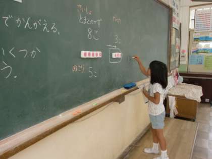 黒板で数図ブロックを動かしたり,式と答えを書いて話したり