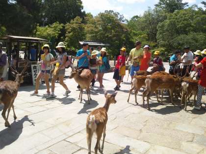 バスで奈良公園に到着し,大仏殿まで歩いていきました。たくさんの鹿が出迎えてくれました。