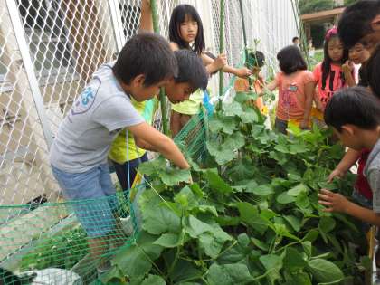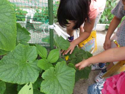 歓声があがりました。 キュウリの葉は,子供たちの顔ぐらいに