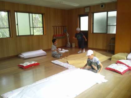 2日(火)第1日目,昼食の後,夜に寝る寝具の準備をしました。バンガローとオリエンテーションホールに分かれて準備をしました。