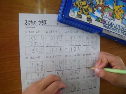 3年生は,算数で3けたの「たし算とひき算の筆算」の学習をしたので,どんぐり学習で筆算の練習に取り組む日もあります。速く正確に計算できるように日々がんばっています。