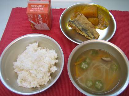 副菜のかぼちゃ煮は,朝から給食調理員さんが苦戦した一品です。立派なかぼちゃが40個ほど届き,包丁で一口の大きさに切るのがとても大変でした。みんながおいしいと残さずに食べてきてくれてよかったです。