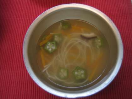 だし昆布と,けずりぶしでおいしいだしをとり,さらにしいたけの戻し汁も加わり,おいしいお汁ができました。オクラを星に,そうめんを天の川に見立てています。