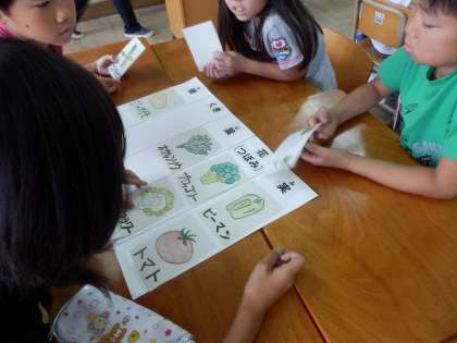 まず,いろいろな野菜のカードを見て,根・くき・葉・花(つぼみ)・実に分けました。