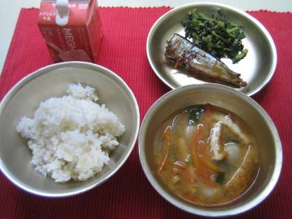 今日の給食は,むぎごはん・牛乳・さんまのしょうが煮・大根葉のごま炒め・いものこ汁でした。ご飯とよく合う和食の献立でした。しかし,児童の食べる様子を見ていると,おかずとご飯を口の中で混ぜながら食べるという食べ方(口中調味)をしている児童が少ないです。そのためか,ご飯が最後に残ってしまい,食べきれないようです。ごはんとおかずを交互に食べる食べ方をいなづま食べといいます。ぜひ,家でもいなづま食べを進めていただき,口中調味しながら食べることのおいしさを感じてください。