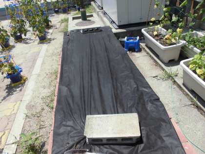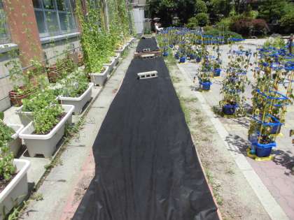 花壇に黒いカーテンを敷きました!このカーテンは,雑草を増やさない効果があります☆まもなくマリーゴールドを植える予定です♪