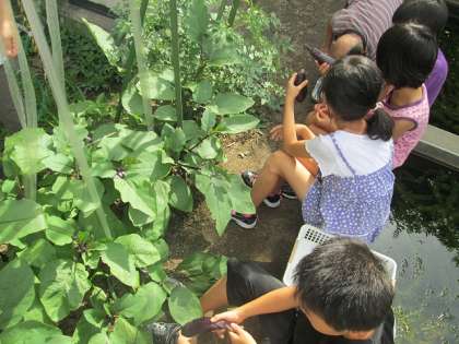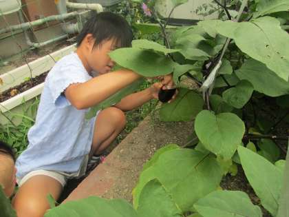かしのみ学級の畑で育てていたナスをみんなで収穫しました。