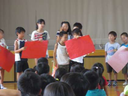 朝会で環境標語 2年