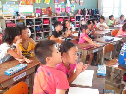 黒板を見て,真剣に隣の子に話している表情を