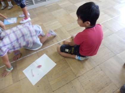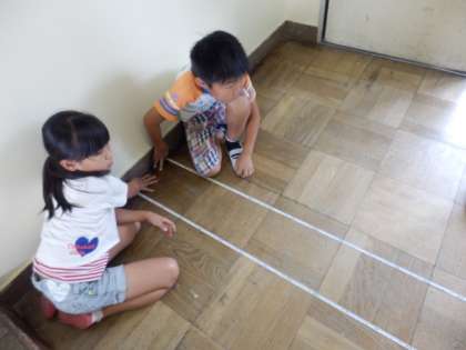 「巻き尺が曲がってる!!教室の床のマス目の線に合わせて測ろう!!」