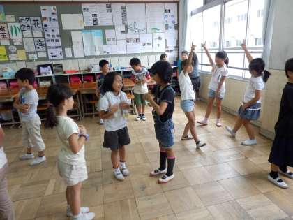 先日,雨が降ってしまいオリエンテーリングが延期になったので,教室で運動会のダンスの練習をしました。