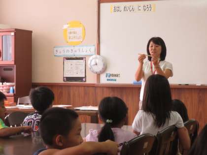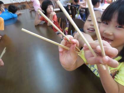 今日はランチルームで山本先生に,正しいおはしの持ち方を