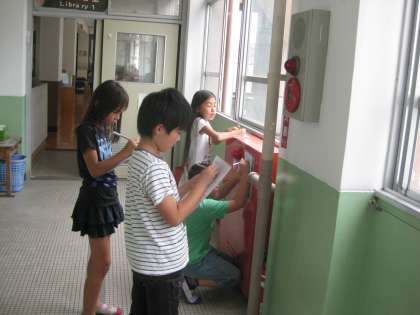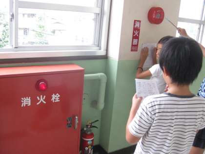 社会科の学習で安全なくらしについて考えています。中でも火災について詳しく調べています!火事の時に私たちの安全を守るものとは…と話し合い,学校の中にある消火器・消火栓・ 防火バケツの数を数えることにしました!