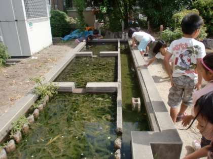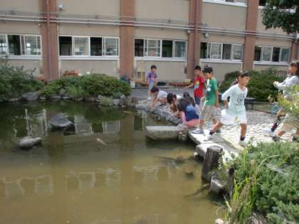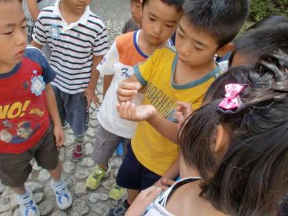 中庭で生き物を見つけて観察しました。