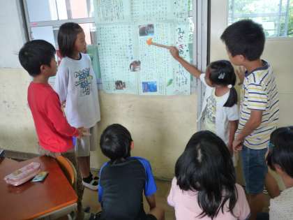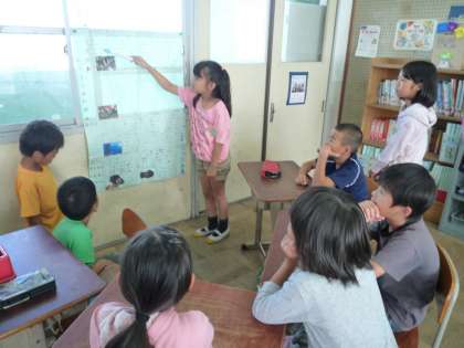 国語の学習で新聞を作りました。出来事や感じたことなどの書きたいことをまとめ,それらを分かりやすいように見出しをつけたりレイアウトを考えたりして作りました。みさきの家でのことを新聞にしました。そして,交流学習として3年生にその新聞を読んで発表しました!来年への見通しを持ってもらおう!と伝えました。中にはクイズをして楽しんでもらう班の姿もありました。3年生が「野外炊事大変そう!」「ナイトハイクおもしろそう!」と話しているのを聞き,うまく伝わったなと自分たちの新聞発表に満足できたようでした!