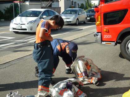 また,防火衣を何秒で着ることができるのかという問題から,実際に着させて頂きました。20秒で着て現場へと向かわれると聞いてびっくり!