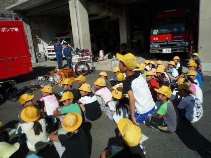 西京消防署に見学に行きました!ポンプ車の中を見せて頂いたり,「消防車はなぜ赤い?」「どんな建物が火事になりやすいの?」等の質問に答え頂いたりと熱心に話されていることに耳を傾けていました。
