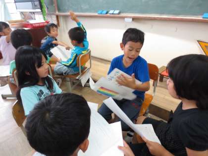 グループで一人一人発表してお互いに質問をしています。