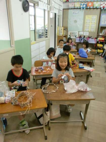 持ってきた材料をうまく使って素敵なリースに仕上がりました。