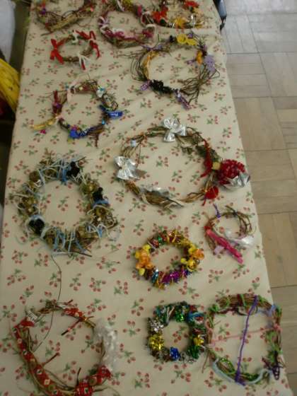 種とりをたくさんした後で,つるを外してリースを作りました。