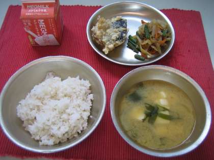 今日の給食は麦ごはん・さばの竜田揚げ・野菜のきんぴら・みそ汁でした。学校給食では赤(たんぱく質・カルシウム)・黄(炭水化物)・緑(ビタミン・無機質)などバランスよく組み合わせ,できるだけ多くの食品を摂取できるように考えています。また,今日は季節の食材のごぼうを使用したきんぴらでした。明日は柿が出ます。秋ですね。