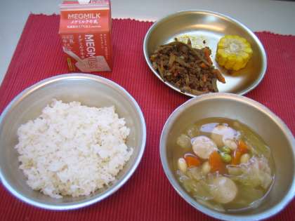 今日の給食は麦ごはん・和風ドライカレーの具・ソーセージと野菜のスープ煮・カットコーンです。