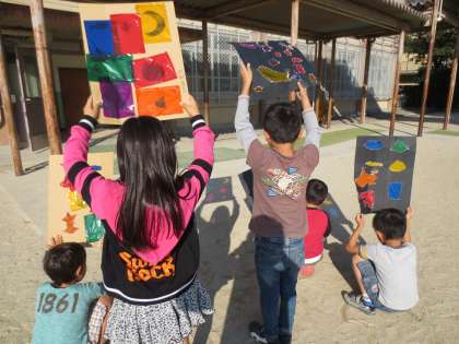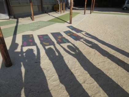 太陽の光を通すときれいな色の形が地面に映り,それぞれ力作を