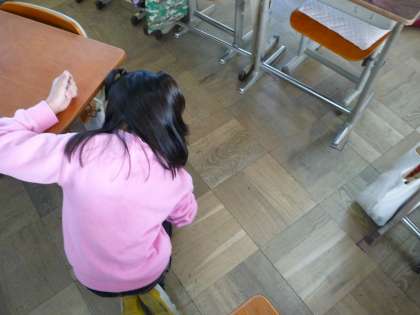 放課後,床にひざをついてコソッと動いている人影を見つけました!何をしているのかと覗き込むと…図工の時間に落ちた紙のくずやテープの切れ端などの細かいゴミを,一つ一つ拾ってゴミ箱へ捨ててくれていました。