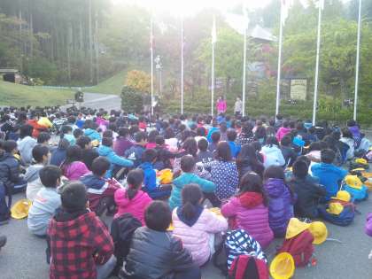 朝のつどいが始まりました☆朱雀第四小学校、上高野小学校と樫原小学校の3校で学校紹介をしました☆気温は7度です。寒いです。