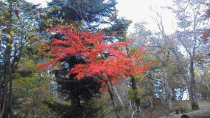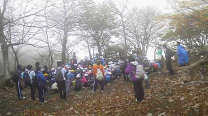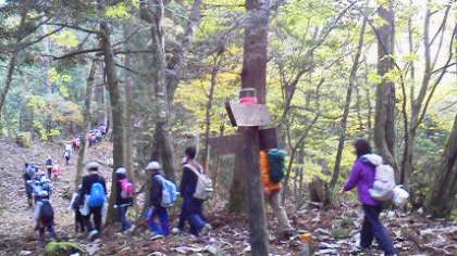 頂上に到着しました。木々が色づいていて,紅葉がきれいです。今日は,自然の中での昼ごはんです。食べ次第,山をおります。