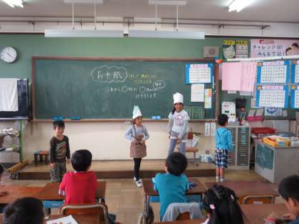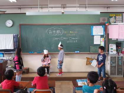 読み取った後,班ごとに劇をしました。お面をつけると