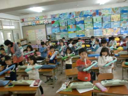 鍵盤ハーモニカを手に持って演奏する練習をしました。