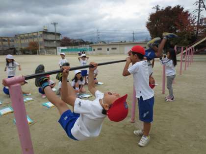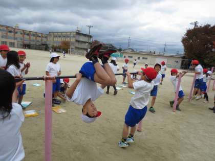 鉄棒でじゃんけんゲームをした後,前回りおりとさかあがりが