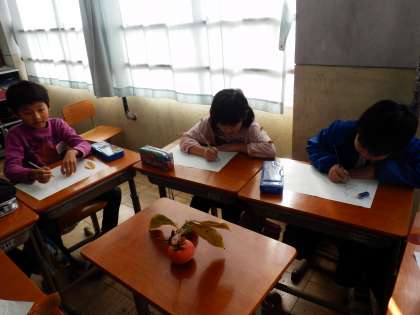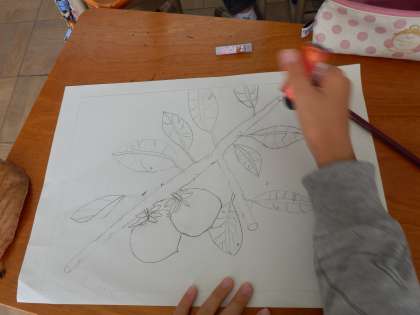 つるんとした実,大きく迫力のある葉などを,みんなよく見ながら描いていました!!