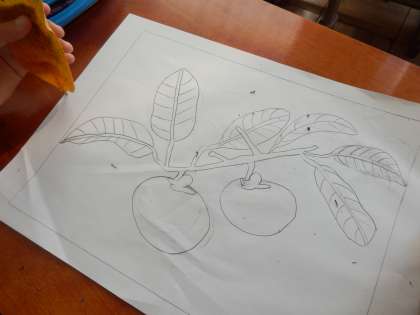 柿の実を枝ごと採り,下書きをしました。