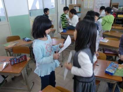 ワークシートをもとに友達と交流しています。