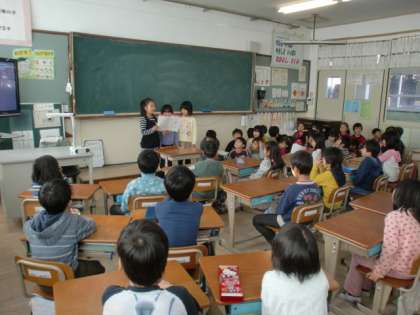 2年生が町探検で学んだことを1年生に紹介してくれました。