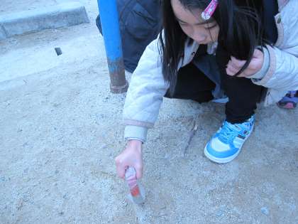 今日は,前時で学んだ「じしゃくに引きつけられるものは鉄」ということを使って,運動場に砂鉄を探しに行きました。
