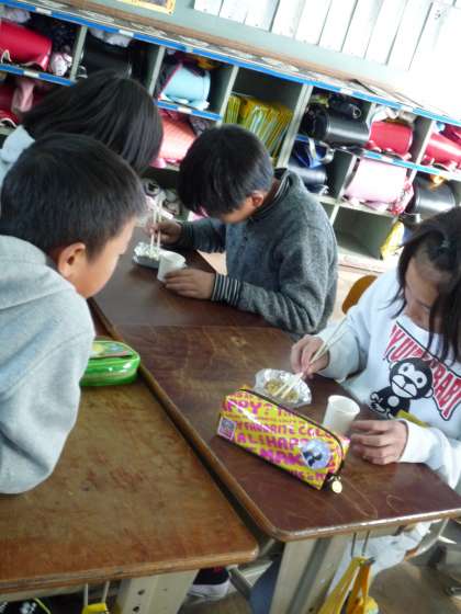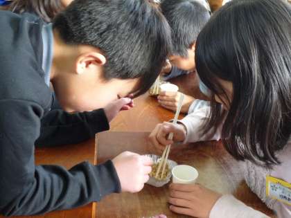 今度の給食週間に行われる豆つまみ大会に向けて練習しています。