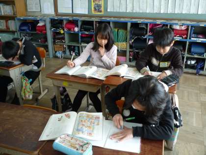 国語の「漢字の広場」で3年生の時に習った漢字の読み方や使い方を復習しながら文を作りました。その後,全員が発表しました。みんなの前で自分の考えを緊張せずに言えるようになりました。
