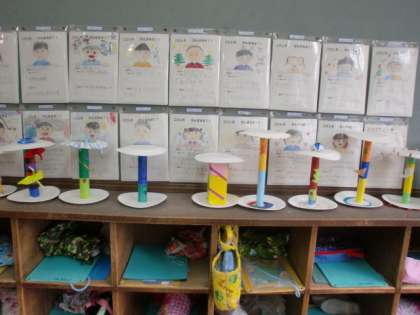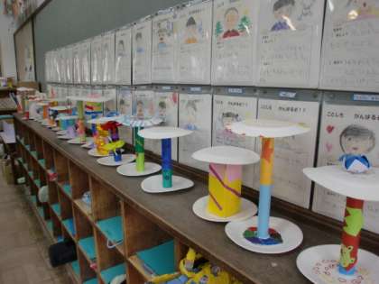 作品がだんだん出来上がってきました。ロッカーの上に展示しています。