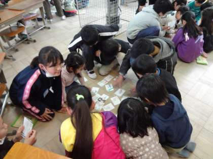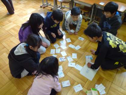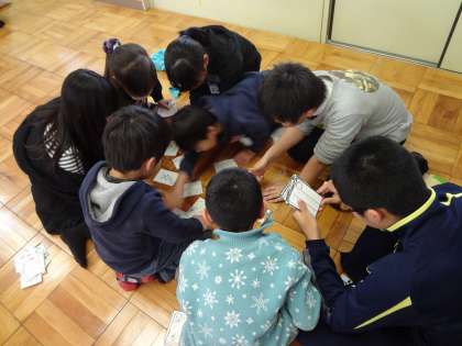6年3組は1年生に誘っていただいて,1年生がつくったカルタで交流しました。