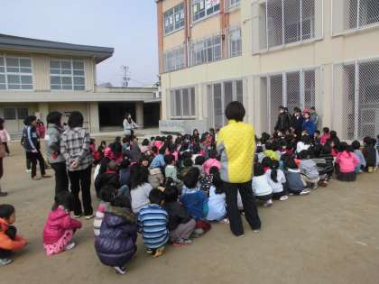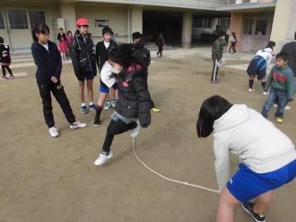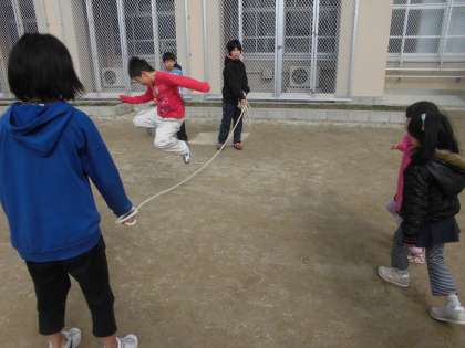 今日の中間休みに1年生の大縄大会がありました!寒い中,元気よく縄を跳んでいましたよ☆各クラス,力を合わせていました♪
