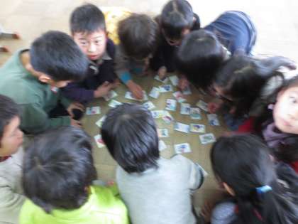 頭が真ん中によってる写真はその下にカルタがあるんです!